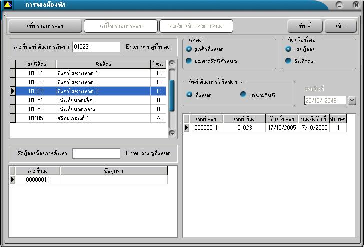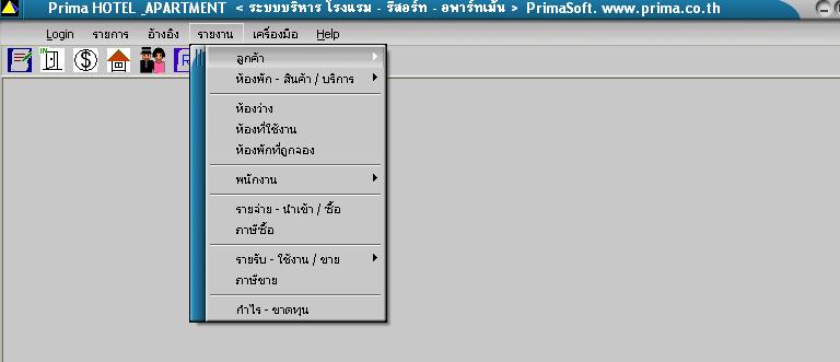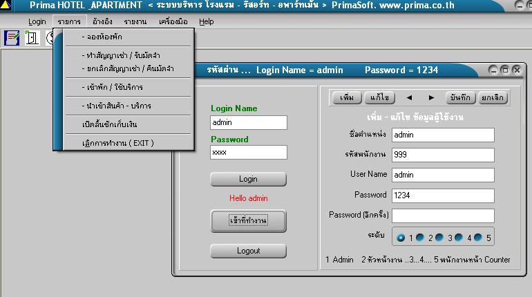 โปรแกรมบริหารการโรงแรม - หอพัก โปรแกรม Prima HOTEL & APARTMENT เป็นชุดโปรแกรมสำหรับการบริหารระบบการให้บริการห้องพัก แบ่งเป็น 2 ระบบ คือ ระบบบริหารโรงแรม รีสอร์ท บังกาโล และระบบบริหารคอนโดมิเนียม หอพัก บ้านเช่า กำหนดได้โดยผู้ใช้งานเอง โปรแกรมถูกออกแบบมาให้ใช้งานง่ายมาก ผู้ใช้ไม่จำเป็นต้องมีความรู้ด้านคอมพิวเตอร์มากนัก ก็ใช้งานได้แล้ว สามารถช่วยงานด้านเอกสารต่าง ๆ เช่น สัญญาเช่า เงินประกัน ห้องว่าง ห้องใช้บริการ ห้องจอง การคิดค่าน้ำ ค่าไฟ ค่าโทรศัพท์ ฯลฯ ได้เป็นอย่างดี นอกจากนั้นยังสามารถ จำหน่าย อาหาร เครื่องดื่ม สินค้า ของที่ระลึก ต่าง ๆ ได้อีกด้วย โปรแกรม Prima HOTEL & APARTMENT นี้ ใช้ได้กับสถานบริการห้องพัก ห้องเช่า บ้านเช่า ทั่วไป ที่ต้องการความทันสมัย ถูกต้อง สะดวก รวดเร็วในการให้บริการห้องพัก การจอง และช่วยในการสรุปผลประกอบการ มีความยืดหยุ่นสูง ปรับให้ใช้ได้กับทุกกิจการ รองรับเครื่องอ่านบาร์โค๊ด ลิ้นชักเก็บเงิน ***เครื่องพิมพ์สลิป ทำงานบน Window 98 / me / xp ใช้ได้ทั้ง Stand Alone และ *** ระบบ LAN คุณสมบัติ 1. การทำสัญญา การรับเงินประกัน จัดทำสัญญาลูกค้าเช่าห้องพัก เลือกห้อง วันเริ่ม – วันสิ้นสุดสัญญา เลือกลูกค้าจากทะเบียนลูกค้า หรือเพิ่มลูกค้าใหม่ กำหนดเงินประกัน และพิมพ์สัญญา 2. การสิ้นสุดสัญญา ถ้าเลือกระบบอพาร์ทเม้นท์ บ้านเช่า จะกำหนดสิ้นสุดสัญญาเอง แต่ถ้าเลือกระบบโรงแรมจะสิ้นสุดเมื่อ ออกจากห้องพักโดยอัตโนมัติ 3. การจองห้องพัก จัดเก็บข้อมูลการจองห้องพัก ล่วงหน้า แสดงผลห้องพักที่ต้องการดู ตามวันที่กำหนด สั่งให้แสดงเฉพาะลูกค้าที่ต้องการ หรือลูกค้าทั้งหมด ได้ กำหนดให้เรียงลำดับจากวันที่จอง หรือเลขที่จองก็ได้ 4 . เข้าพัก / ใช้บริการ เมื่อลูกค้าเข้า Check In จะมาลงทะเบียนที่นี่ เพื่อเลือกห้องพักที่ว่างอยู่ หรือเข้าสู่ห้องที่จองไว้ล่วงหน้า สามารถพักรายการชั่วคราว เพื่อสะสมขอดเงินและจ่ายรวมตอน Check Out 5. ทะเบียนห้องพัก ค้นหา และรายงาน จำนวนห้องต่าง ๆ ที่มี โดยเลือกค้นหาเฉพาะห้องที่ต้องการ หรือจะดูภาพรวมทั้งหมดก็ได้ ตารางแสดงห้องที่มี ห้องที่กำลังใช้งาน และห้องที่ยังว่างอยู่ 6. ทะเบียนสินค้า – บริการ มี Stock สินค้าสมบูรณ์ปรับทันทีเมื่อมีการใช้งาน สินค้าต่าง ๆ เช่นอาหาร เครื่องดื่ม ของที่ระลึก เลือกให้ตัด หรือไม่ตัด ได้รายสินค้า ทำให้สะดวกและยืดหยุ่นต่อการใช้งาน 7. ทะเบียนพนักงาน จัดเก็บข้อมูลพนักงาน กำหนดเงินเดือน กำหนดค่าคอมมิสชั่น หรือค่าจ้างรายครั้ง 8. การขายสินค้า / บริการ สามารถขายอาหาร เครื่องดื่ม ของที่ระลึกต่าง ๆ รวมถึงการเพิ่มอุปกรณ์ใช้